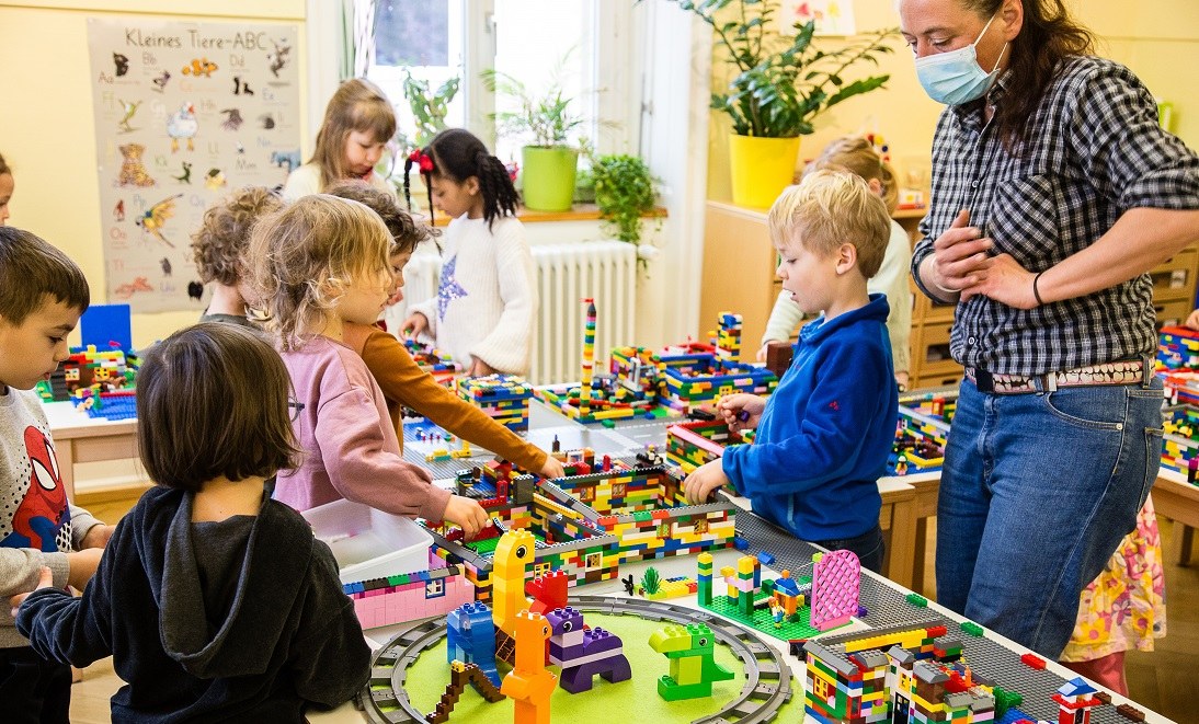 Schon die vierte Woche leitet Salome Oppliger in diesem Doppelkindergarten das Projekt «Wir bauen unsere Stadt», immer wieder mit neuen Inputs. Viele Meter lang ist die entstandene Stadt, mit Häusern aller Art. Diese haben keine Dächer, sondern sind oben offen, sodass die verschiedenen Zimmer mit Figuren bespielbar sind. Denn für Kindergartenkinder ist das soziale Spielen mindestens so wichtig wie das Konstruieren. In der Stadt gibt es auch einen Spielplatz, Brücken, Treppen, Gärten, ein Baumhaus, einen Zoo und sogar eine Zugstrecke.