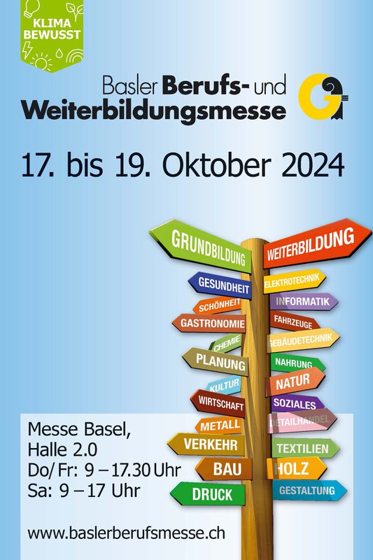 Berufs- und WeiterbildungsmesseDer Gewerbeverband Basel-Stadt stellt an der diesjährigen Berufs- und Weiterbildungsmesse die Nachhaltigkeit ins Zentrum. Dazu gehören leicht rezyklierbare Materialien für den Bau der Messestände ebenso wie der vermehrte Einsatz von digitalen Geräten anstelle von Drucksachen. Ausserdem gibt es vegetarische und vegane Verpflegung aus möglichst regionalen Produkten, kostenloses Leitungswasser für alle oder langlebige Give-aways. In Zusammenarbeit mit dem Verein Genderbox möchte die BBWM Jugendliche bei der Berufswahl zudem Gender-Stereotypen bewusst machen und sie dafür sensibilisieren. Für Eltern und weitere Interessierte gibt es Führungen durch die Messe in verschiedenen Sprachen. Berufs- und Weiterbildungsmesse (BBWM), Donnerstag, 17., bis Samstag, 19. Oktober 2024 in der Halle 2 der Messe Basel, 9 bis 17.30 Uhr (Samstag bis 17 Uhr), Eintritt kostenlos, Reservation für Besuche mit Schulklassen erforderlich unter www.basler-berufsmesse.ch. |