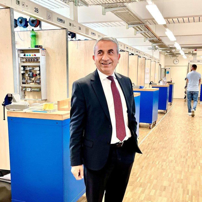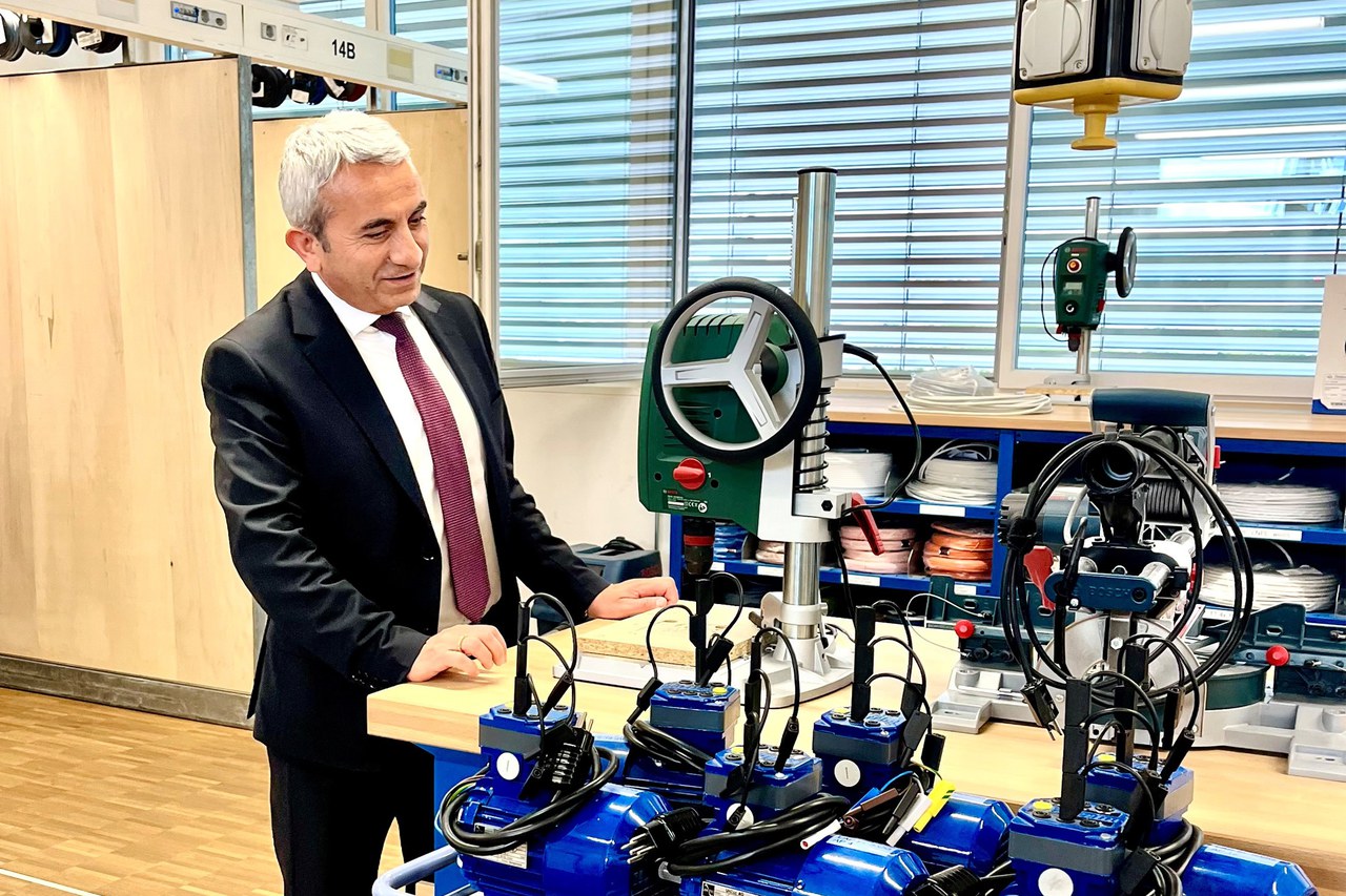 Auch an der Berufs- und Weiterbildungsmesse können Besuchende anpacken und ausprobieren: Departementsvorsteher Mustafa Atici im Juni an der «Elektroinstallateur/-in EFZ»-Abschlussprüfung.