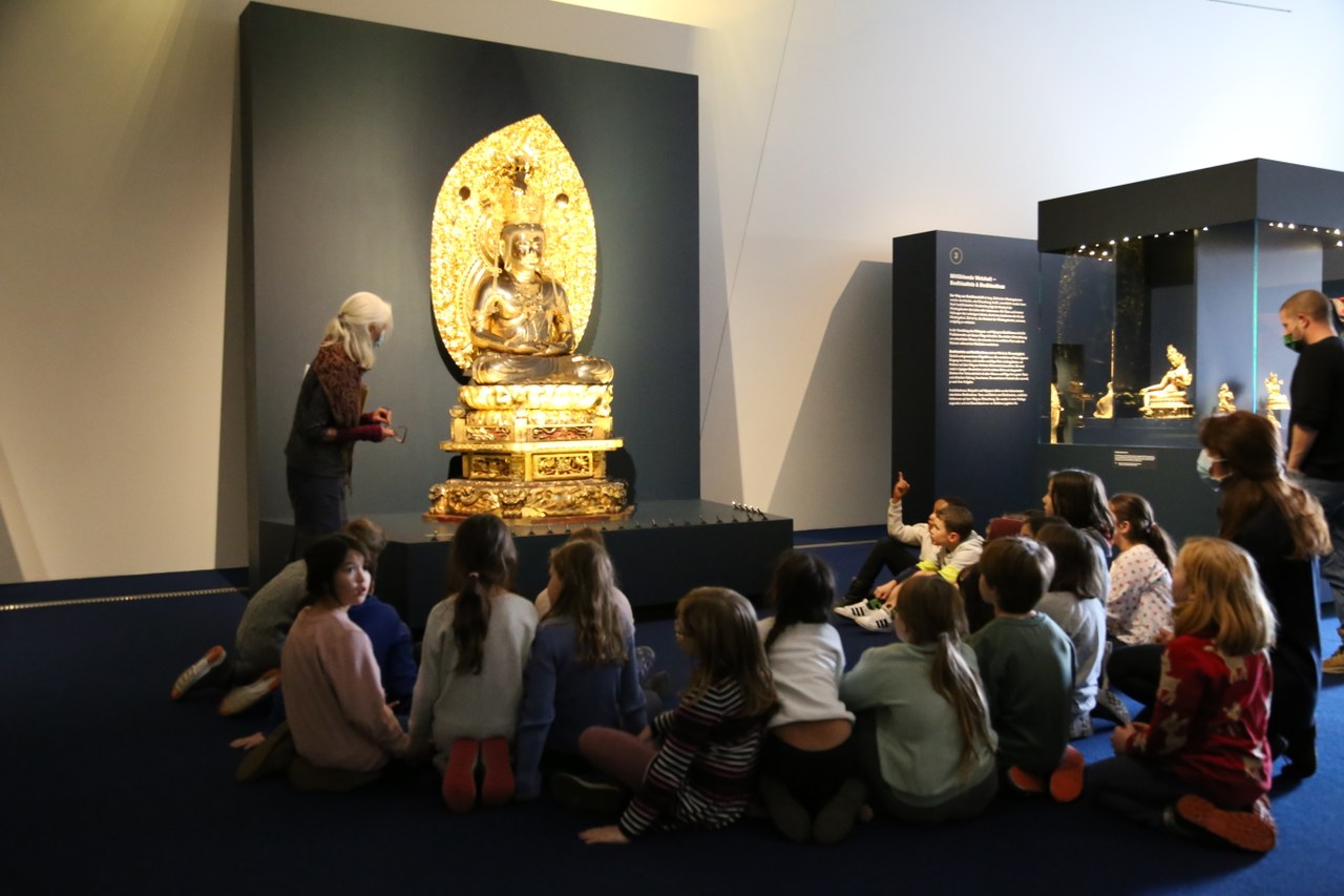 Anhand geschickt ausgewählter Objekte erfährt die Klasse so auf ihrem Rundgang durch den obersten Stock des Museums, wieso der erleuchtete Buddha nicht nur in sitzender Position meditierend, sondern oft auch stehend oder gar schlafend abgebildet ist. Oder was Gläubige aus den Gesten und Fingerstellungen der Figuren ablesen können. Immer wieder gelingt es Regina Mathez, den Kindern so auch spirituelle Inhalte zu vermitteln wie das Streben jedes Buddhisten, aus dem Kreislauf von Wiedergeburten auszubrechen. Und so ganz nebenbei dürften die meisten auch mitbekommen, dass sich im Laufe der Jahrhunderte regional sehr unterschiedliche Ausprägungen des Buddhismus herausgebildet haben.