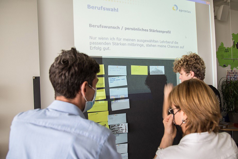 Das simulierte Gespräch findet im Rahmen eines zweistündigen Workshops statt, den vor allem Lehrpersonen von E-Zügen im zweiten Sek-Jahr kostenlos buchen können. Gebucht wird via Handelskammer (siehe Box). Ein paar Wochen später stehen die «Business-Coaches» bereits im Klassenzimmer. An diesem Vormittag im Drei Linden sind das Thomas Gysin und Evelyne Chevrolet, bei «aprentas» für die Berufsinformation verantwortlich. Die beiden stellen zuerst den Ausbildungsverbund «aprentas» vor, der in naturwissenschaftlichen, technischen und kaufmännischen Berufen ausbildet. Anschliessend muss die Klasse aber sehr schnell selber aktiv werden. Es gilt, Berufswünsche auf Kärtchen zu schreiben. Auf anderen Kärtchen hält die Klasse fest, welche Fähigkeiten für diese Berufe gefragt sind. Eine Übung nicht ganz ohne Hintergedanken.