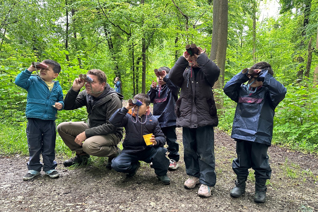 «Vogel», ruft es aufgeregt und alle rennen durcheinander mit dem Feldstecher vor dem Gesicht umher und wollen finden, was ein Einzelner entdeckt hat. Thomas Steiner beruhigt die Gruppe und erklärt: «Bei der Vogelbeobachtung muss man still stehen wie ein Stein.» Sofort kehrt Ruhe in die Kindergruppe ein, die Feldstecher werden gerichtet. Diese fokussieren den Blick der jungen Forschenden. «Eine Rabenkrähe», benennt Thomas Steiner den grossen Vogel auf einem hohen Ast. Die Kinder lernen neben den Vogelarten, auch ihr Verhalten den Waldtieren anzupassen. Mit langsamen Schritten nähert sich die Gruppe später einer anderen Rabenkrähe, die sich über das verlassene Znüni hermacht. Der Lerneffekt der ersten Begegnung wird umgesetzt, fast hätte man die Rabenkrähe aus nächster Nähe beobachten können. Diese hat sich dann aber doch entschieden, sich in die Sicherheit des Waldes zurückzuziehen. Die Kinder sind stolz, so nah dran gewesen zu sein. Bei jeder Begegnung werden die Kinder näher an die Tiere rankommen und diese so besser kennen und verstehen lernen.