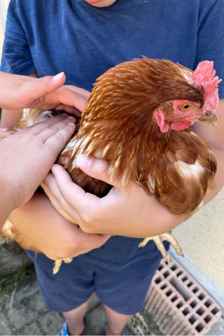 Beim Mittagessen herrscht eine gesellige, aber ruhige Atmosphäre. Die Kinder konzentrieren sich auf das Essen, während die Klasse von Stephan Schmidt am Tisch sitzt, als wäre sie schon immer hier gewesen. Bevor sie sich auf den Heimweg machen, dürfen die Kinder auf dem Bauernhof spielen. Die meisten besuchen die Hühner, streicheln sie und stecken Grashalme durch das Gitter, wobei sie geduldig die leisen Reaktionen der Tiere beobachten.