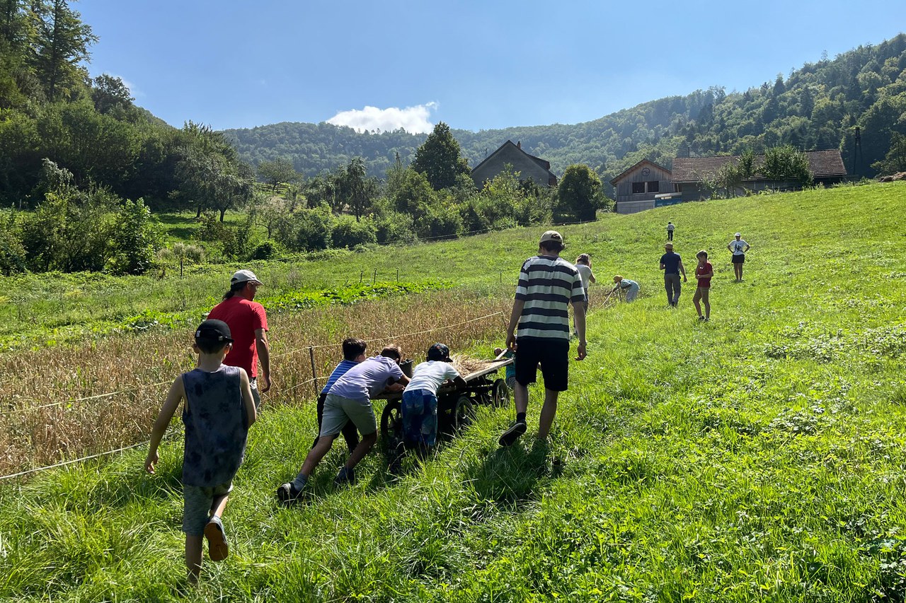 Die Sonne steht hoch am Himmel. Es ist heiss, und die Kinder sind hungrig und müde. Während die meisten mit der Ernte beschäftigt sind, bereiten ein Sozialpädagoge und zwei Schüler den Mittagstisch vor. Es ist Zeit für eine wohlverdiente Pause. Einige Jungen ziehen und schieben den mit Getreide beladenen Wagen den Hang hinauf.