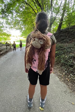 Nach einer Tram- und Zugfahrt startet am Bahnhof Aesch die Wanderung. Der Weg führt sanft bergauf, durch den Wald, entlang eines Bachs und an Brombeersträuchern vorbei. Für die Kinder ist es ein grosses Abenteuer. Ein Mädchen trägt das Klassenmaskottchen, einen Stoffaffen namens Jim, im Rucksack. «Jim schläft», flüstert sie, während sie über einen umgestürzten Baum klettert. Eine andere Schülerin behauptet, eine Spinne gesehen zu haben. «Wo?», fragt ein Junge. «Da hinten», sagt sie, ohne eine Richtung anzugeben. Schritt für Schritt geht es weiter – bis der Bauernhof in der Ferne auftaucht.