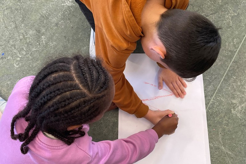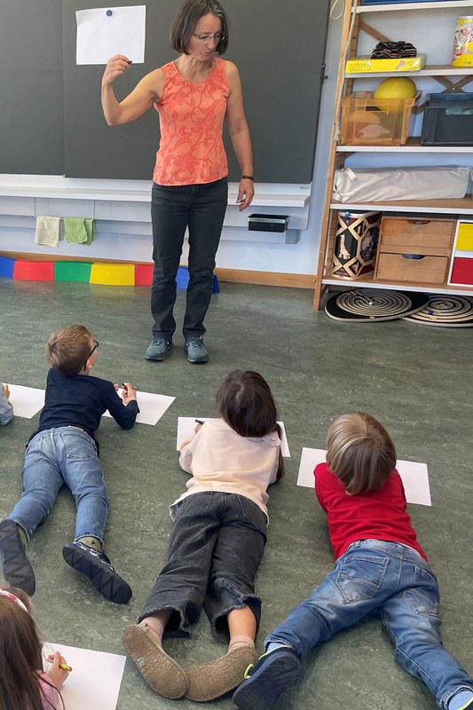 Ohne dass dies vorgegeben war, kommen in diesem Spiel schnell einmal die ersten Buchstaben ins Spiel, die einige Kinder schon kennen und benennen können. Aus den Diagonalen, die mit farbigen Stäbchen auf den Boden ausgelegt wurden, ergibt sich rasch einmal ein grosses W oder ein M. Und beim gruppenweisen Zeichnen auf dem Bauch erkennen die Kinder spielerisch, dass sich bei den Kritzeleien wie von selbst einzelne Buchstaben ergeben. Das grösste Kompliment an diese spielerische Art des Heranführens an die Handschrift kam beim Besuch des Schulblattes ganz am Schluss: «Was, die Stunde ist schon fertig?» sagte mehr als ein Kind zu Catherine Gerber mit staunenden Augen. «Und wann kommen Sie wieder, um die Geschichte von Maxi weiter zu erzählen und mit uns zu malen?» Peter Wittwer