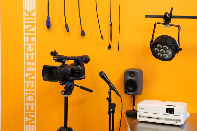 - Camcorder mit Speicherkarte (AVCHD), Stative, externe Mikrofone für Interviews, stationäre Videoleuchten
