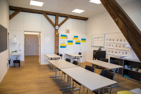 Quinn geht in die 3. Klasse der Sekundarschule Sandgrube und besucht nach den Ferien ein Gymnasium. Die gelb-blauen Willkommensschilder mit kyrillischen Buchstaben machen ihr schnell klar, dass in diesem Zimmer ukrainische Kinder unterrichtet werden.