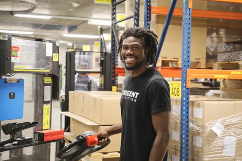 Eddie Bäumner ist den ganzen Tag auf den Beinen. Der angehende Logistiker EFZ lernt, die Arbeitsabläufe in einem Warenlager optimal umzusetzen.