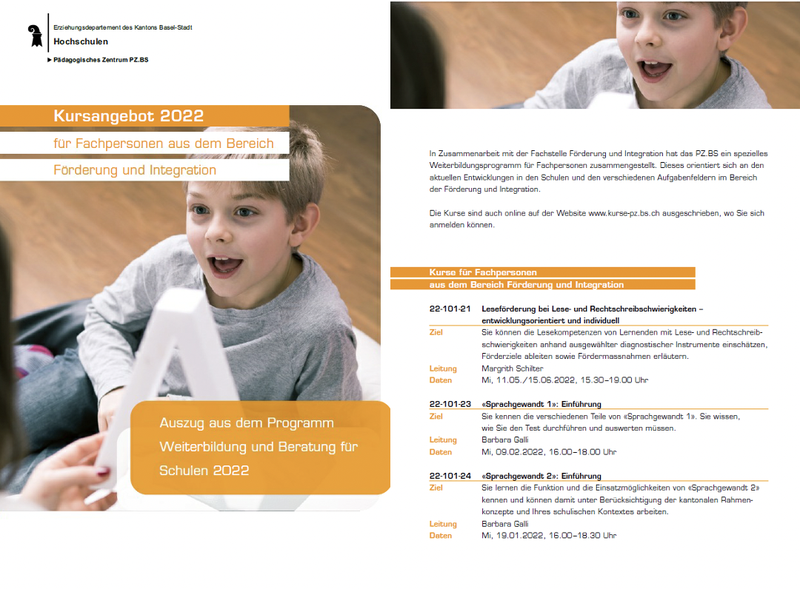 In Zusammenarbeit mit der Fachstelle Förderung und Integration hat das Pädagogische Zentrum PZ.BS ein spezielles Weiterbildungsprogramm für Lehr- und Fachpersonen zusammengestellt. Dieses orientiert sich an den aktuellen Entwicklungen in den Schulen und den verschiedenen Aufgabenfeldern im Bereich Förderung und Integration.