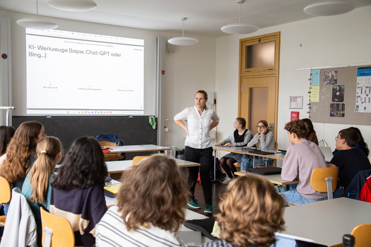 Christina Holzwarth fragt die Klasse, wofür sie künstliche Intelligenz schon verwendet habe. Drei Schülerinnen erzählen begeistert, wie sie mit Hilfe von KI Bilder generieren. Andere berichten davon, ChatGPT die verrücktesten Fragen gestellt zu haben, bis sie der Chatbot – so das Spiel der Teenager – zum Therapeuten geschickt habe. Tatsächlich befasst mit den Möglichkeiten und Gefahren von KI hat sich allerdings noch niemand – bis auf eine Schülerin, die erzählt, dass KI im MINT-Unterricht ihrer vorherigen Schule besprochen wurde.