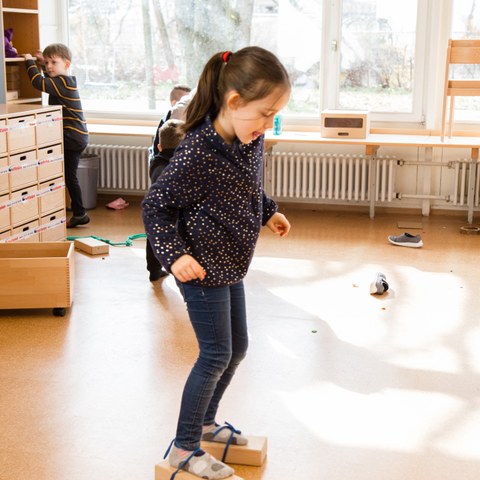 «Nie wieder!», dachten beide Lehrpersonen am Anfang des Projekts. Dann kam die Wende. Nach etwa zehn Tagen begannen die Kinder Ideen zu entwickeln, Spiele zu erfinden und sich zunehmend miteinander auszutauschen. Als habe es Klick gemacht! Der Schulblatt-Redaktorin zeigte sich bei ihrem zweiten Besuch ein lebhaftes Bild: Eugene ist ein Feuerdrache. Hinten in seiner Trainerhose steckt ein bauschiger Schwanz aus roten, und gelben Chiffontüchern. Durchaus friedlich besucht der Drache andere Kinder in deren Haus aus Tischen und Tüchern, während einige unermüdlich Runden auf ihrem selbstgebauten Parcours drehen: Über eine Treppe aus Bauklötzen geht es über den Korpus auf den Fenstersims, von da über Tische, Stühle, eine Brücke und Bänke zum Absprung … und nochmal. Und nochmal.