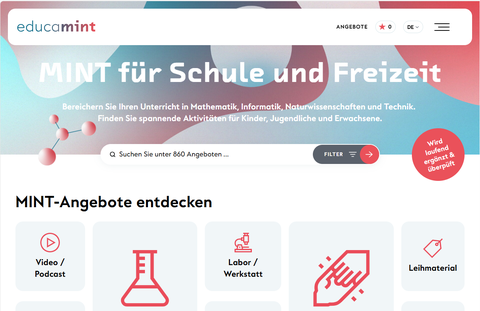 Die Schweizerische Akademie der Technischen Wissenschaften SATW liefert auf der Plattform educamint Tipps, Newsletter und ein Angebotsverzeichnis, das hilft, spannende Aktivitäten und begleitendes Unterrichtsmaterial zu finden. educamint informiert laufend über neue und aktuelle schulergänzende Angebote im Bereicht MINT, in der Datenbank können schweizweit über 900 Angebote abgefragt werden.
