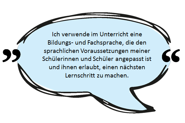 Um den inhaltlichen Anforderungen gerecht zu werden, brauchen Sprachhandlungen im (Fach-)Bereich eine angepasste Bildungs- und Fachsprache. Sprachbewusst unterrichten heisst, den Schülerinnen und Schülern Hilfestellungen («Scaffolds») beim Aufbau dieser Bildungs- und Fachsprache anzubieten.