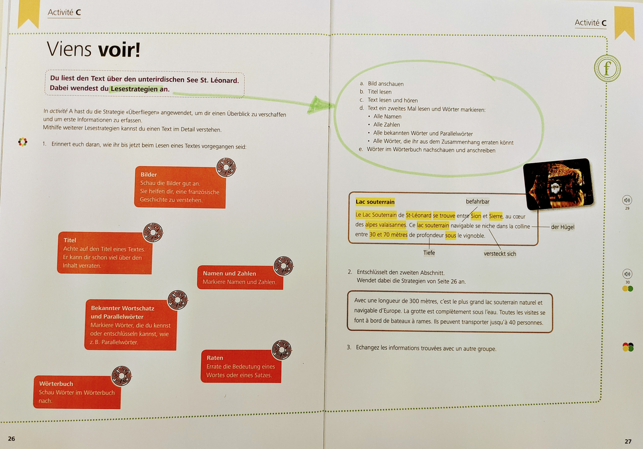 Zudem lernen die Schülerinnen und Schüler nicht nur einzelne Wörter, sondern auch sogenannte Chunks, die als Sinneinheiten genutzt werden können, auch wenn das grammatikalische Wissen dafür noch nicht erworben wurde. In gewissen Lehrmitteln werden die Strategien sehr sorgfältig und bewusst vermittelt, beispielsweise in Mille feuilles 5.1 auf den Seiten 26 und 27: